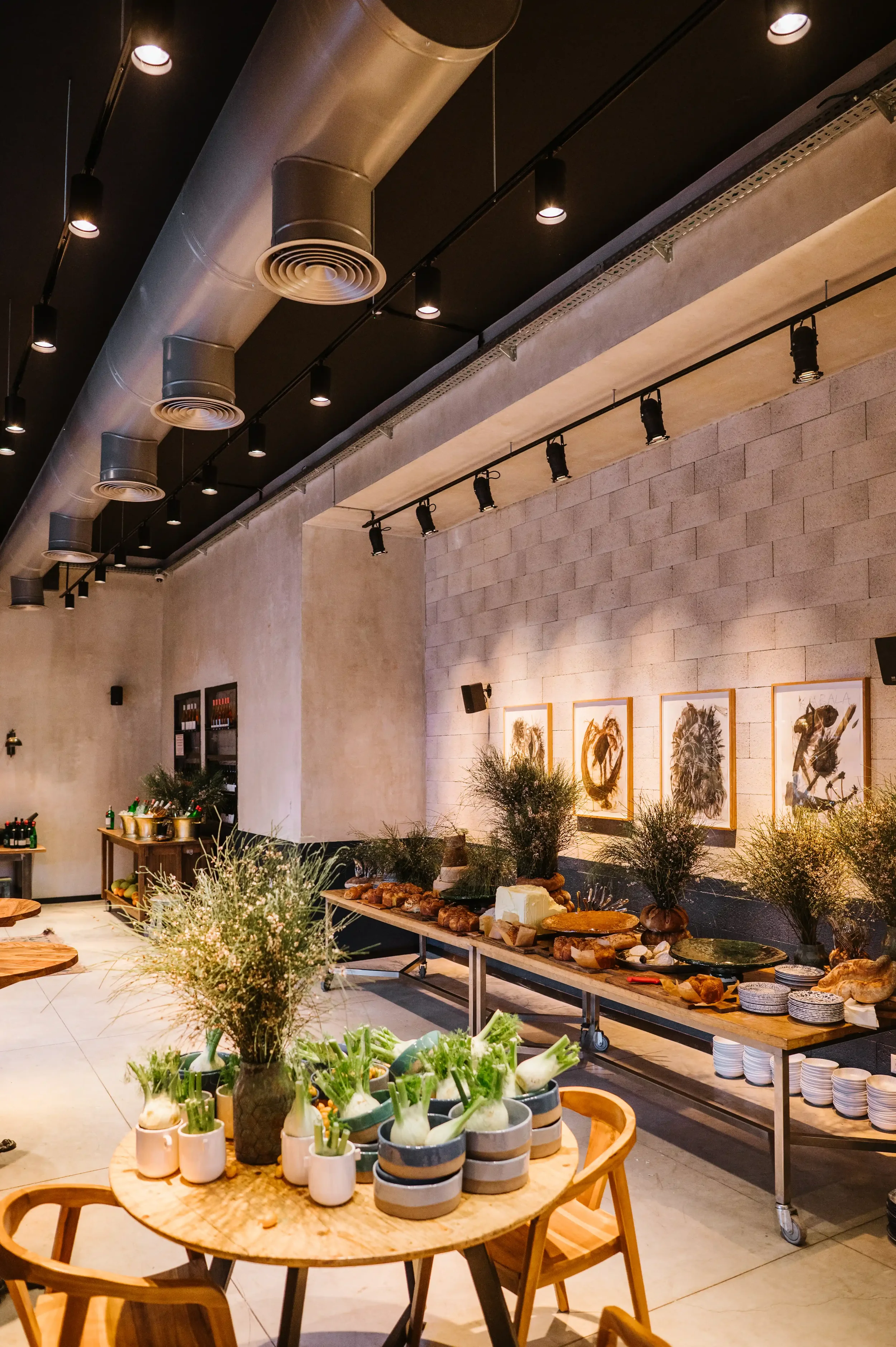 Our new hosting space for boutique events was born out of a desire to create a fascinating, dual experience: on the one hand, the intimate, creative, and free-spirited feel of an artist's studio, and on the other—precision, meticulousness, and the highest standard of hospitality. At the heart of the design are the new openings we created, which draw clear inspiration from the traditional window divisions of a Parisian atelier. The iron and glass frames not only let in an abundance of natural light but also elegantly frame the space. To complete the authentic feel, the interior walls received a unique treatment, giving them an aged, multi-layered appearance. Their textures are designed to look as though the space has stood here for years, absorbing layers of paint, history, and stories, waiting to be the perfect backdrop for your next event